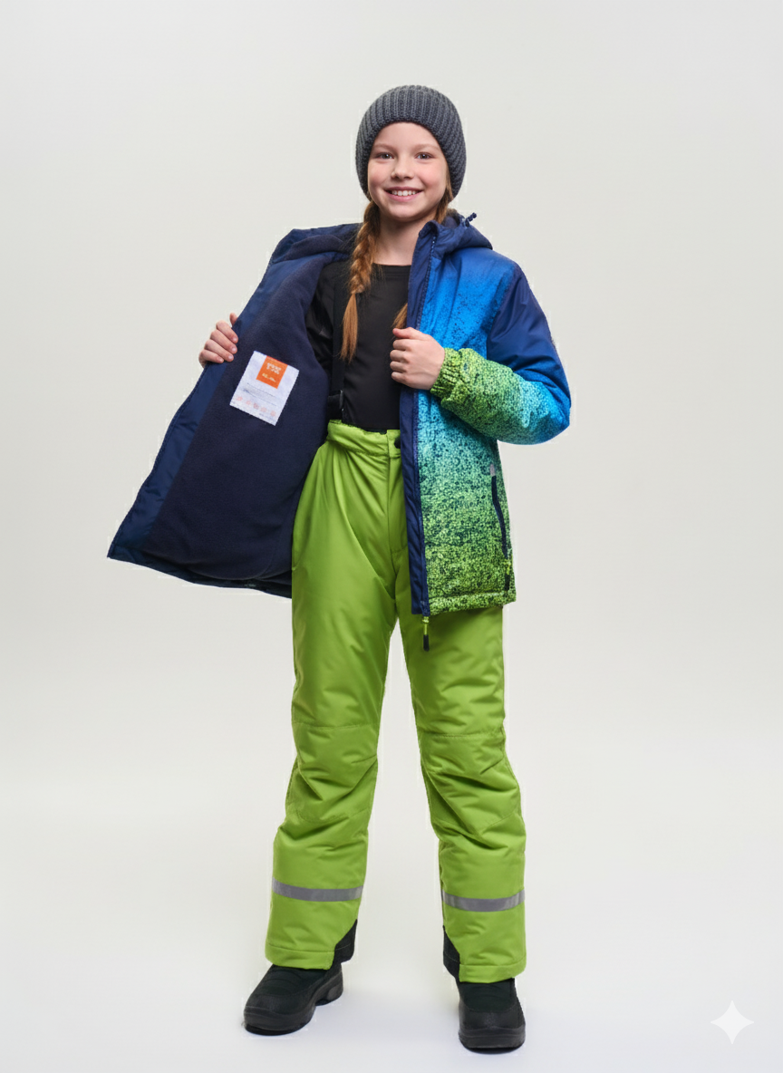 Наполнитель: 100% полиэстер, вес 200 г/м2 Брюки: материал верха 100% полиэстер с водоотталкивающей пропиткой, ветронепродуваемая и водонепроницаемая, «дышащая» трехслойная мембрана 5000/5000 с покрытием TPU.